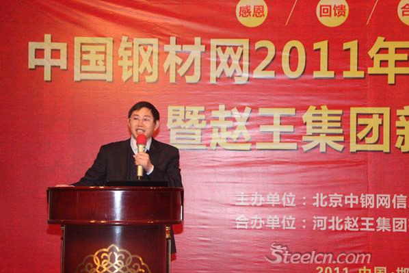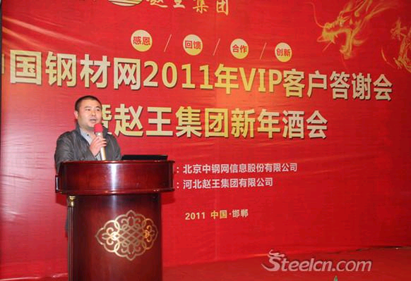 中国钢材网讯:12月17日下午,由中国钢材网和河北赵王集团联合举办的2011年VIP客户答谢会在邯郸成功举行,中国钢材网首席运营官李玉良、首席分析师李宇军,邯郸分公司经理黄金阳和赵王集团副总经理李玉波及200多名邯郸的钢贸商朋友参加了本次活动。